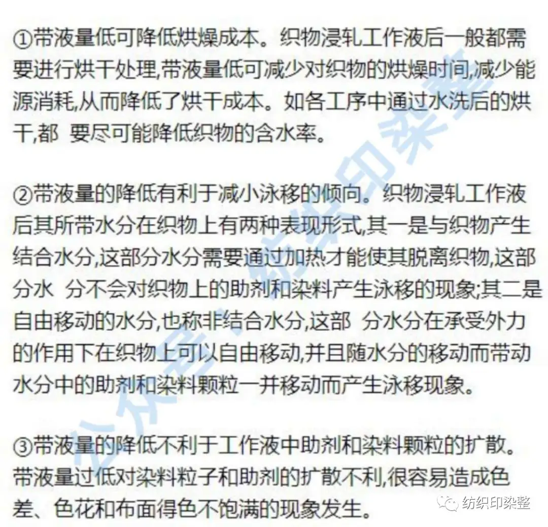 ②带液量的增加会造成烘燥成本的增加,同时还会造成泳移的概率增加。