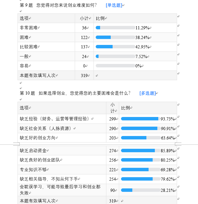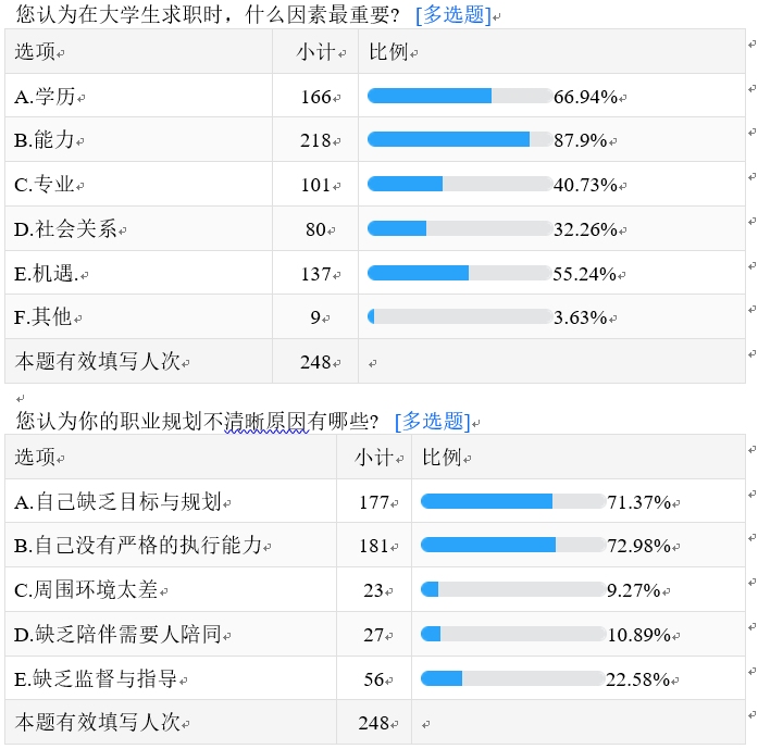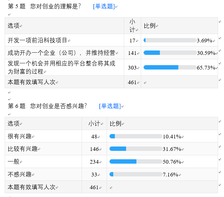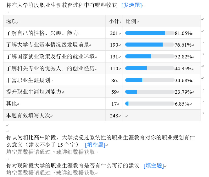 开展了职业生涯规划问卷和创业意向调查问卷:问卷涉及学生对职业生涯规划的认识、理解,对未来职业选择的要素,对学校在职业生涯教育方面的意见和建议等。创业意向调查问卷针对低年级学生开展,旨在了解学生对创新创业教育的理解与期待,挖掘有创业兴趣和创业基础的学生,为更好构建学生职业生涯教育与就业指导工作提供有力参考。