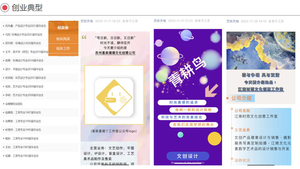 利用企业及成功校友资源,建立创业人才库,通过开展校企交流会、企业开放日、星火聊天室等活动为创业学生与企业家搭建交流平台。与苏州片刻文化创意有限公司、苏州聿怀网络技术有限公司等文创类公司开展深入交流,为学院创业团队进一步成长奠定了基础。