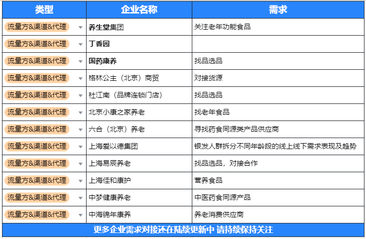 我们确认了养生堂、丁香园、国药康养、上海爱以德、杜江南、六合(北京)养老、中海锦年康养、格林公主(北京)商贸等企业参会并将在现场选品,欢迎营养食品商家来现场洽商合作!