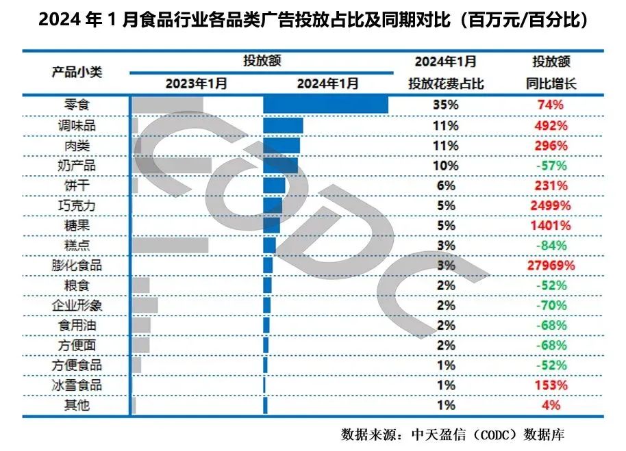从食品行业各品类的投放花费占比来看,2024年1月零食、调味品和肉类占据前三的位置,合计占食品行业总投放额的57%。对比2023年,2024年1月食品行业各品类的投放格局大不相同,零食稳步攀升至首位,调味品和肉类投放额同比增长两倍以上,投放占比大幅扩张;此外,巧克力、糖果和膨化食品在2024年1月投放花费表现抢眼。据亿滋国际最新发布的《2023年全球零食现状报告》调查结果显示,虽然全球经济和地缘政治环境发生变化,但是零食消费却在持续增长。这也解释了零食等品类投放火热的原因。