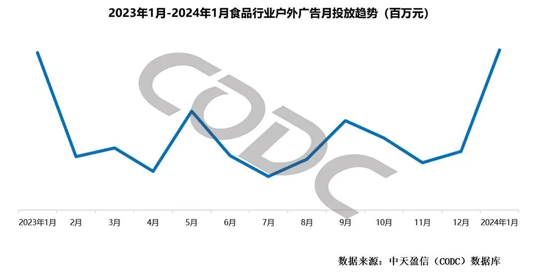 从户外广告月度投放情况看,2023年食品行业广告投放波动起伏较为明显,受到春节、“618购物节”和中秋国庆假期等节日影响,食品行业在1月、5月和9月广告投放力度较大,其中1月达到峰值。而据国家统计局数据,2023年全年粮油、食品类消费品零售额达18,887亿元,同比增长5.2%。受此影响,今年1月份食品行业的广告投放再回高峰,环比高增长一倍多,同比小幅增长。