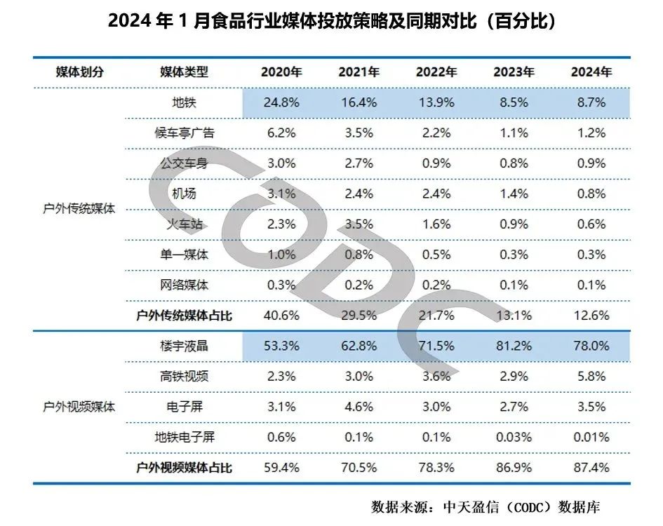 在媒体投放策略上,近五年户外视频媒体的占比逐年提升,其中的楼宇液晶媒体也一直是食品行业最为重视的媒体类型。近两年楼宇液晶媒体飞速发展,投放占比也逐渐提升,2024年1月接近90%,其通常位于写字楼大厅和电梯等候区等高流量区域,面向中高端消费人群,使得楼宇液晶媒体拥有独特的传播优势和市场发展潜力,成为品牌推广和宣传的重要选择。