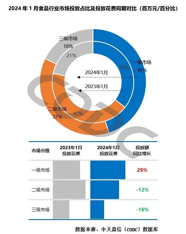 从市场投放情况看,食品行业品牌的投放策略在2024年初发生了变化,2024年1月相比2023年1月,二三级市场的占比都有减少,其中二级市场占比下滑6个百分点,而一级市场投放占比显著提升,超越二级市场,成为品牌最为看中的市场。也仅有一级市场投放花费同比增长,二三级市场都有不同程度的下滑。