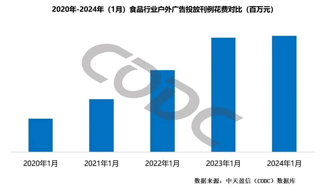 近五年,虽然各行业都受到疫情的影响,但食品作为生活必须品,行业的广告投放还是保持着较为良好的态势。中天数据显示,食品行业近五年1月份的户外广告投放额逐年增长。2021年-2023年三年同期更是连续增长40%以上,显示出蓬勃发展的势头,2024年1月,食品行业广告投放的增长幅度开始收窄,同比仅微增2%,但仍然延续增长趋势。