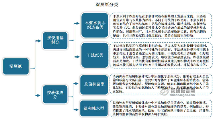 根据观研报告网发布的《中国湿厕纸行业发展现状分析与投资前景研究报告(2024-2031年)》显示,湿厕纸按使用基材分类,可分为木浆水刺非织造布类与干法纸类;按液体成分分,可分为杀菌抑菌型与温和纯水型。