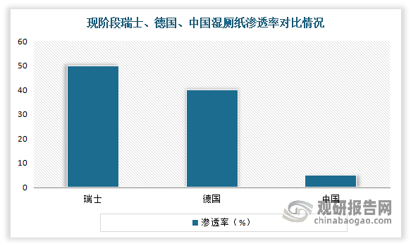 目前在欧美发达国家,湿厕纸已经得到普及。例如瑞士湿厕纸的渗透率已经达到50%,即每2人中就有1人在使用湿厕纸,德国湿厕纸的渗透率亦接近40%。而我国湿厕纸的渗透率仅有5%,仍有很大的提升空间。产品普及度较低,同时意味着湿厕纸是目前当之无愧的蓝海品类。预计随着消费者消费意识及结构的改变,渗透率有望进步提高,从而带动市场规模提升。