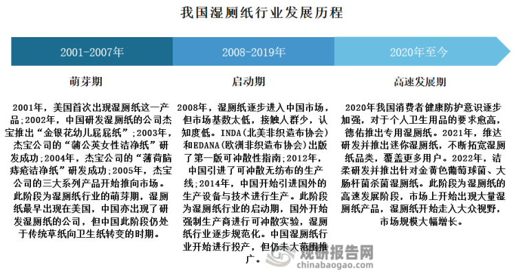 我国湿厕纸行业开始发展于21世纪初,但当时由于国内仍处于传统草纸向卫生纸转变的时期,因此并未成功推广。直到2020年,随着国内消费者健康防护意识逐步加强加强,对于个人卫生用品的要求愈高,以及德佑推出专用湿厕纸后,才开始走入大众视野,市场也才开始大幅增长。总体来看,自发展以来,我国湿厕纸行业发展先后经历了三个阶段,分别是萌芽期、启动期、高速发展期。