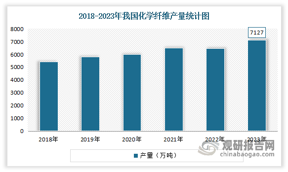 我国是世界纺织、化纤的生产和消费大国。近年来我国化学纤维生产规模稳中有增。数据显示,2023年我国化学纤维产量7127.0万吨,同比增长10.3%。