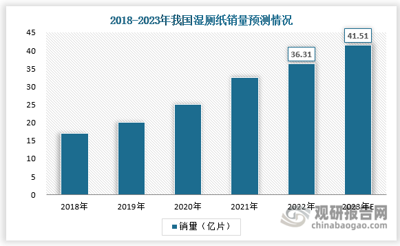 近年来随着居民环保意识的提升以及新零售的兴起,提高了可冲散湿巾的市场认知度,越来越多消费者接触、了解、信任并使用湿厕纸,洁净湿擦已成为居民的一种习惯,湿厕纸的需求量越来越大,销量保持增长趋势。数据显示,2022年我国湿厕纸销量增长到了36.31亿片左右,同比增长11.65%。预计2023年我国湿厕纸销量将进一步增长至41.51亿片右。