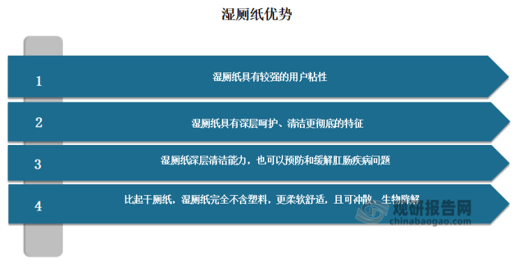 湿厕纸是一种生活用品,主要是以木浆纤维与粘胶纤维为原料,以湿法水刺非织造布或干法纸为基材进行生产,大部分具有可冲散性。湿厕纸是一种湿式卫生纸巾,相对于普通干纸巾,具有卓越的洁净功能和舒适特性,因此逐渐成为厕纸界革命性的新产品。