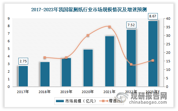 近年我国湿厕纸行业市场规模呈现逐年上涨态势。数据显示,2017-2022年我国湿厕纸行业市场规模从2.75亿元上涨至7.52亿元。估计2023年我国湿厕纸市场规模将在8.67亿元左右。
