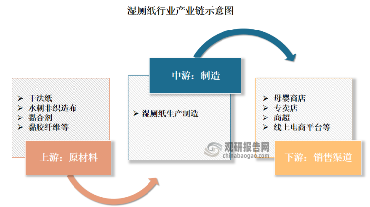 我国湿厕纸行业产业链结构较为清晰。其产业上游为原材料,主要为干法纸、水刺非织造布、黏合剂、黏胶纤维等,中游产业为湿厕纸制造行业;下游为湿厕纸销售渠道,主要为母婴商店、专卖店、商超、线上电商平台等。