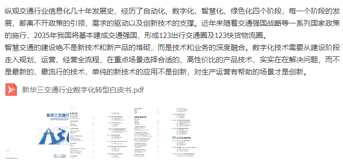 随着智慧业务的发展,对交通骨干网提出了更高要求,如需要更灵活的业务开通、精细化的带宽管理等。针对这些需求,新华三在机场、公路、地铁等多个场景进行了针对性的解决方案——《新华三交通行业数字化转型白皮书》。