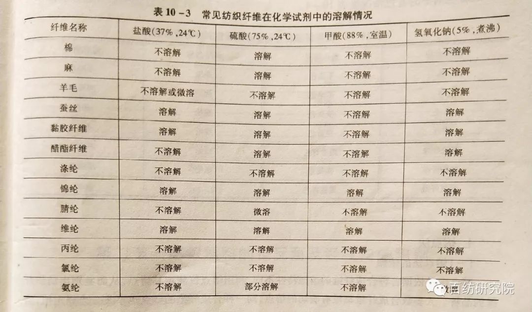 对于纯纺面料,鉴别时,要将定一定浓度的化学试剂加入盛有要鉴别纺织纤维的试管中,然后观察和仔细区分纺织纤维的溶解情况(溶解、部分溶解、微溶、不溶解),并仔细记录其溶解时的温度(常温溶解、加热溶解、煮沸溶解)。