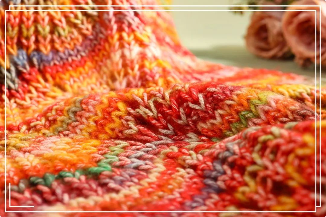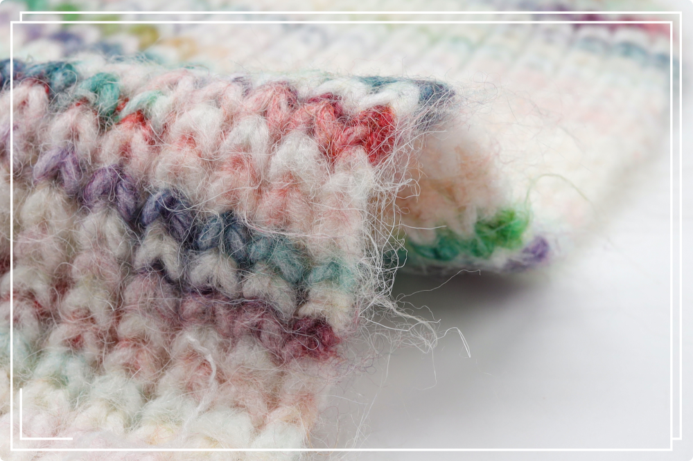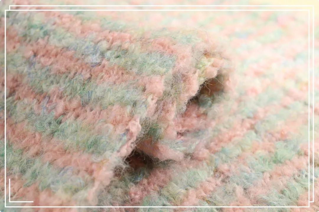 七彩指色多种颜色混在一起,织出来的织物亮丽多彩,能一眼起到吸引人眼球的效果,织物表面毛羽感强烈,细腻轻盈,织成的成衣外形膨松松软,给人一种柔软温暖的视觉效果。