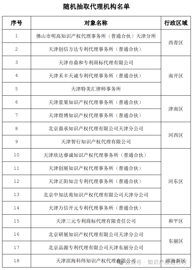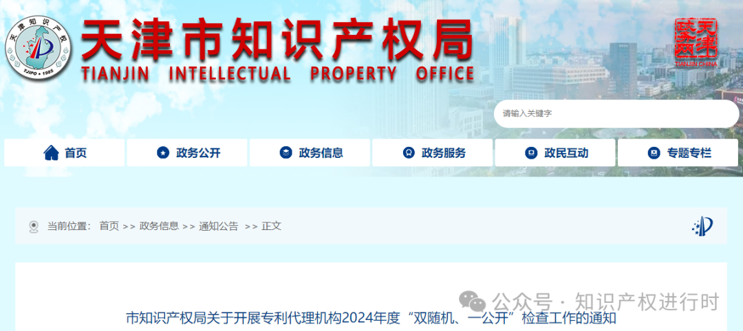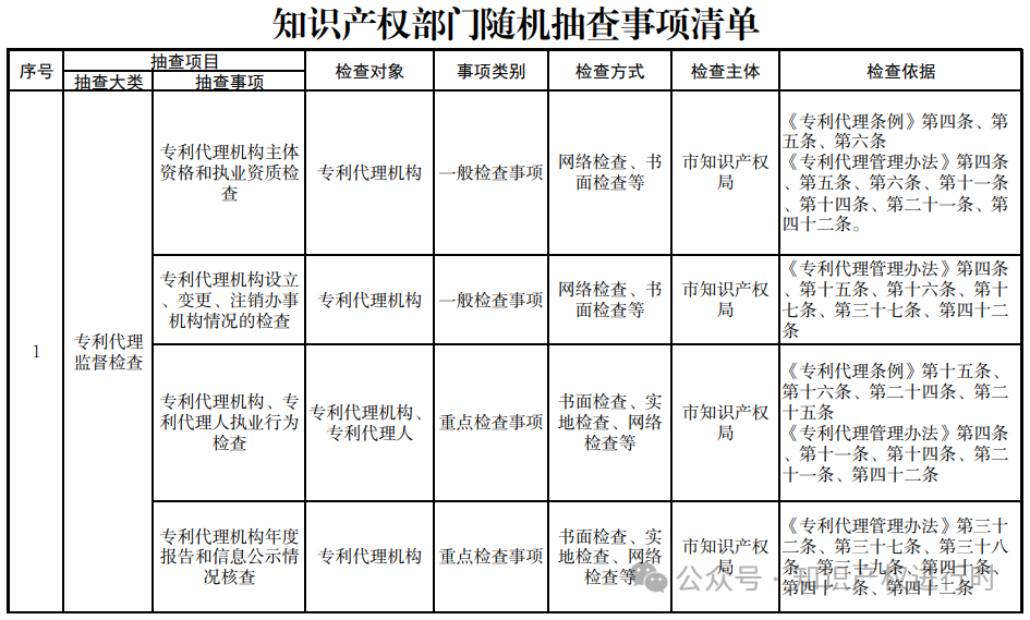 市知识产权局关于开展专利代理机构2024年度“双随机、一公开”检查工作的通知为营造良好的营商环境,有效维护行业秩序,有力促进知识产权服务业健康发展,依法依规加强专利代理行业监管,落实《国家知识产权局关于持续深化知识产权代理行业“蓝天”专项整治行动的通知》精神,日常检查与专项行动相结合,市知识产权局定于2024年4月30日至2024年11月30日,开展专利代理机构“双随机、一公开”检查工作,按属地管理原则,请各区市场监管局对名单内所列专利代理机构予以检查。具体事项通知如下: