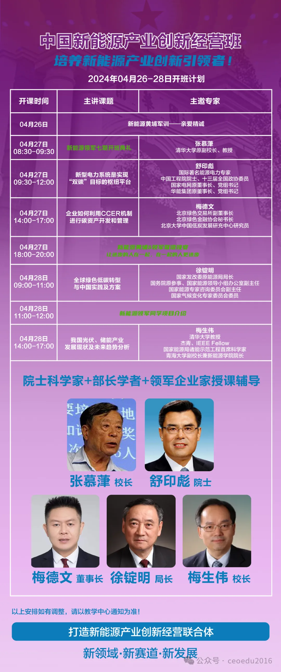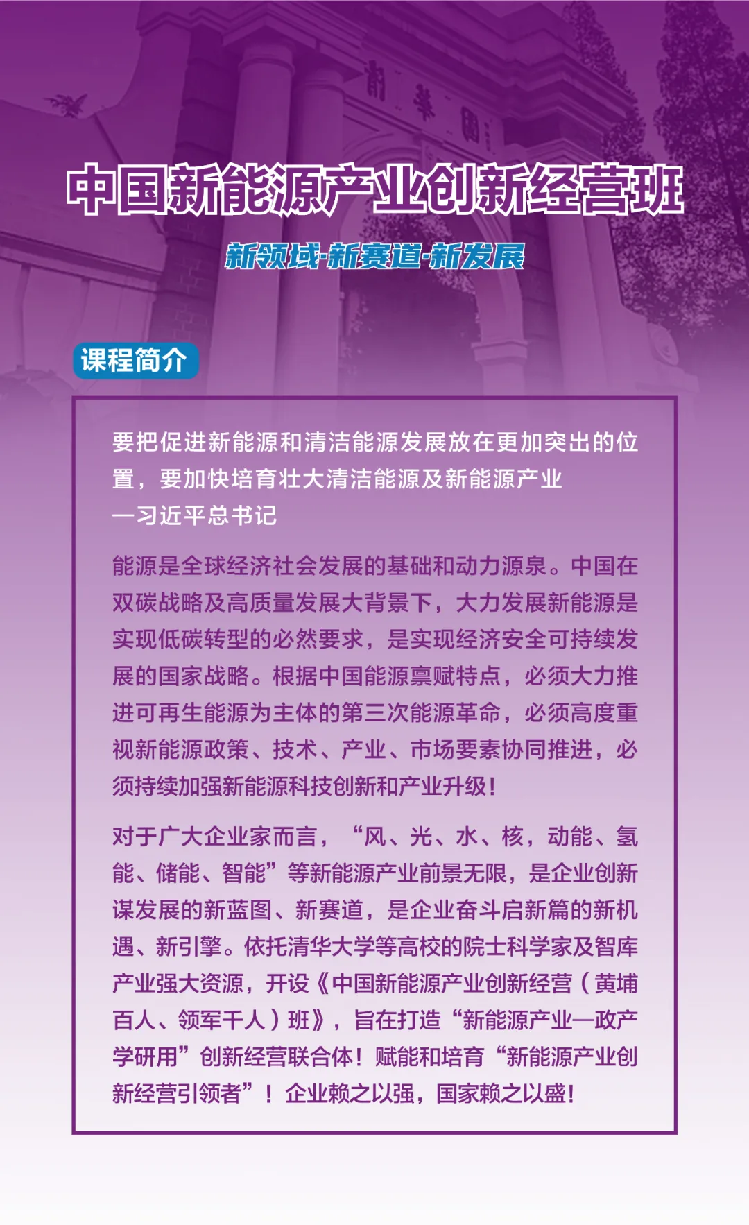 对于广大企业家而言,“风、光、水、核,动能、氢能、储能、智能” 等新能源产业前景无限,是企业创新谋发展的新蓝图、新赛道,是企业奋斗启新篇的新机遇、新引擎。《中国新能源产业创新经营班》依托清华大学等高校的院士科学家及智库产业强大资源, 打造 “新能源产业一政产学研用” 创新联合体!赋能和培育“新能源产业创新经营引领者” !企业赖之以强,国家赖之以盛!