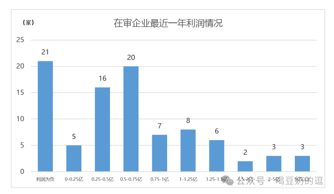 截至当前,科创板在审企业净利润集中在0.75亿元以下,除21家未盈利企业外,其他均为盈利企业。最近一年净利润最小的为-332,669.88万元(旷视科技有限公司,软件和信息技术服务业,与上周相比无变化),最大的为78,696.03万元(中圣科技(江苏)股份有限公司,专用设备制造业,与上周相比无变化)。具体分布如下: