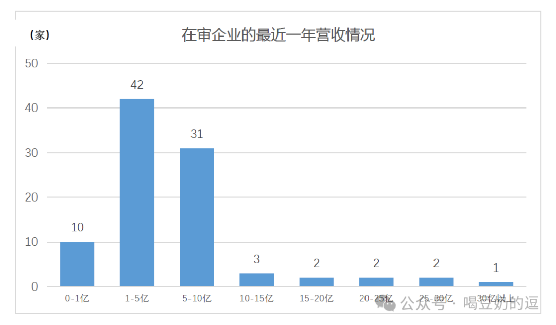 截至当前,科创板在审企业营收集中在1-5亿元之间,营收规模最小的为0万元(第五套标准,共5家企业,分别为深圳善康医药科技股份有限公司、上海恒润达生生物科技股份有限公司、轩竹生物科技股份有限公司、广州必贝特医药股份有限公司,前述4家企业均为医药制造业;以及杭州键嘉医疗科技股份有限公司,专用设备制造业;与上周相比无变化),最大的为423,342.6万元(中圣科技(江苏)股份有限公司,专用设备制造业,与上周相比无变化)。具体分布如下:
