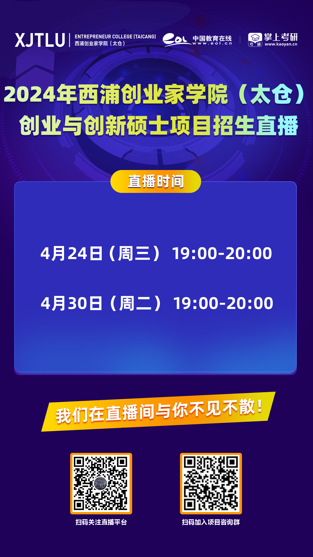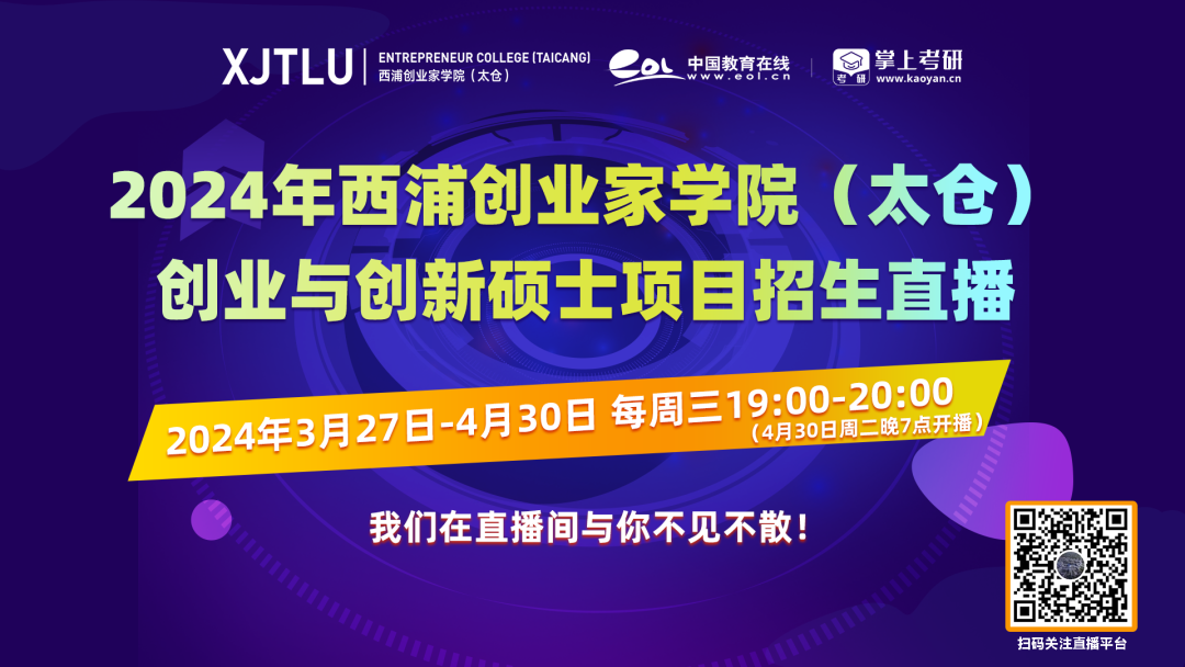 2024年3月27日至4月30日期间每周三或周二,西浦创业家学院(太仓)创业与创新硕士项目将于【西浦创业家学院视频号】进行项目各方向系列招生直播