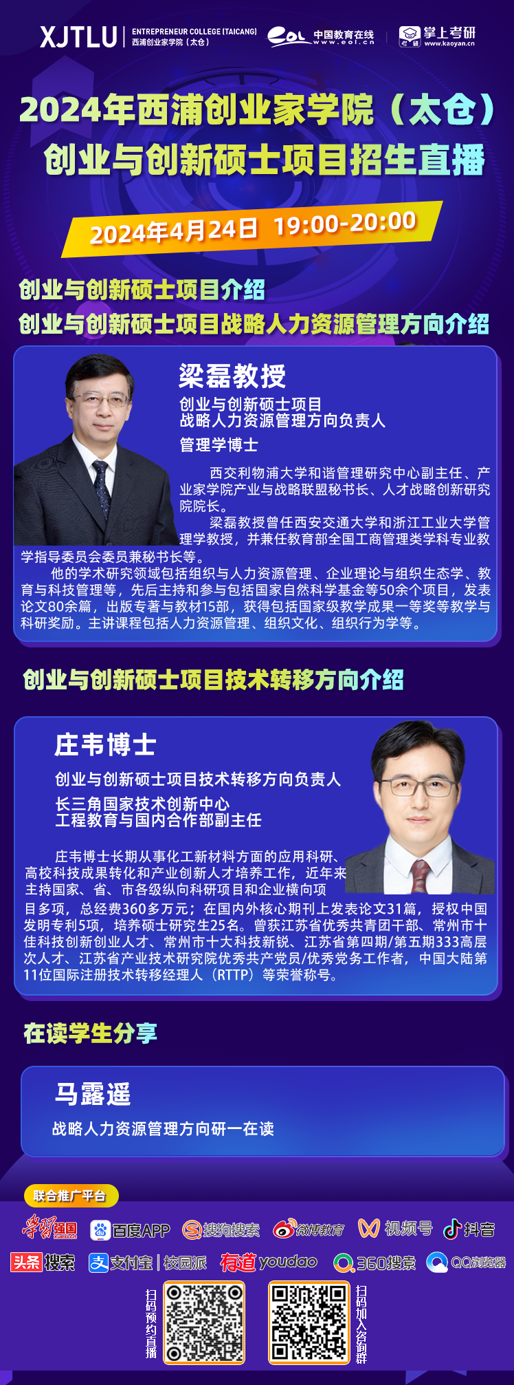 4月24日19时至20时,直播将由两位老师分别对创业与创新硕士项目、战略人力资源管理方向及技术转移方向进行介绍,并邀请了一位在读生分享就读体验,直播预约及具体信息如下: