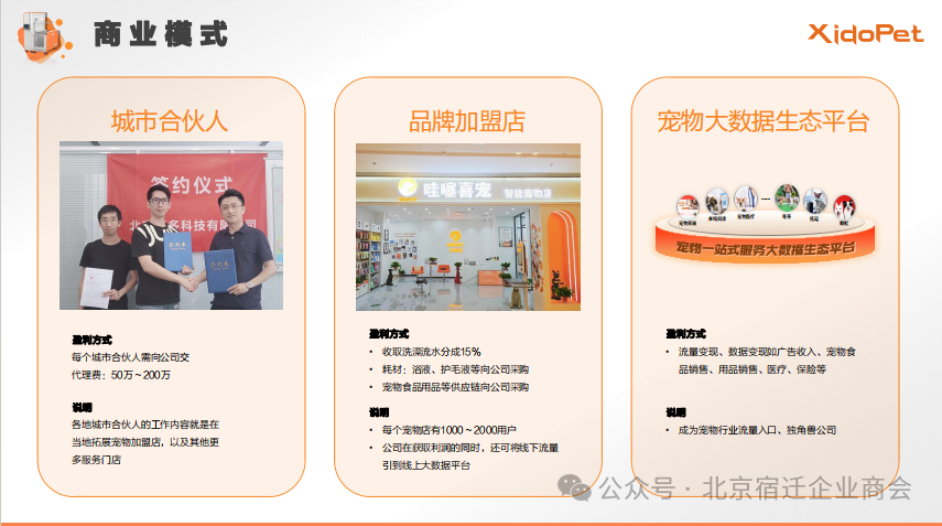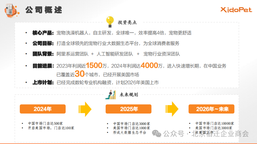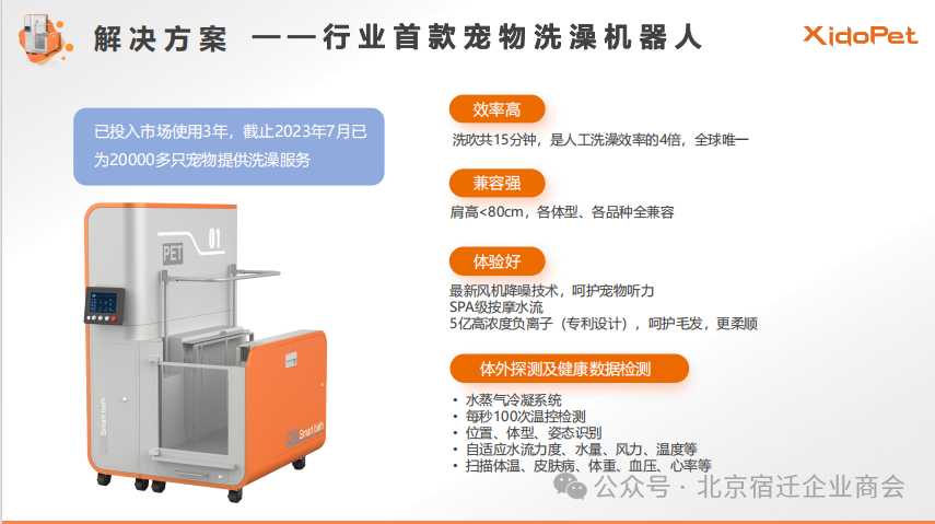 石国伟介绍了公司概况、核心产品和发展前景。北京喜多科技有限公司成立于2016年,是一家专注于宠物行业的人工智能科技公司。公司以研发宠物智能洗澡机器人为核心产品,致力于为宠物主人提供更加便捷、科技、高效的宠物洗浴服务。公司研发团队成员均来自国内外知名科研院校,有丰富的人工智能、大数据、云计算产品研发经验。公司核心产品——宠物智能洗澡机器人,为宠物提供“洗吹”服务的一体化产品,将洗澡效率提高4倍以上,国内唯一、性能远超日美欧的同类产品,是目前全球唯一拥有该技术的公司。宠物智能洗澡机器人不仅能够高效地完成宠物的洗浴服务,还能够检测宠物的体重、血压、心率等健康指标,让主人更好地了解宠物的健康状况。公司专注宠物行业多年,秉持“客户第一、科技驱动、持续创新、视宠物如婴儿”的核心价值观,致力于打造宠物行业的独角兽,为宠物主人提供更好的服务和体验。公司已经完成了多轮专业机构的融资,并计划2024年完成5000家宠物机构合作,3年内成为宠物行业独角兽,2026年完成主板上市。