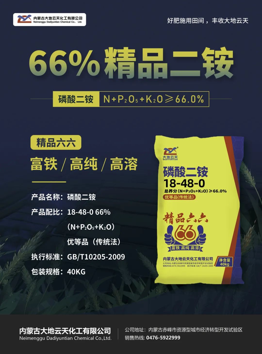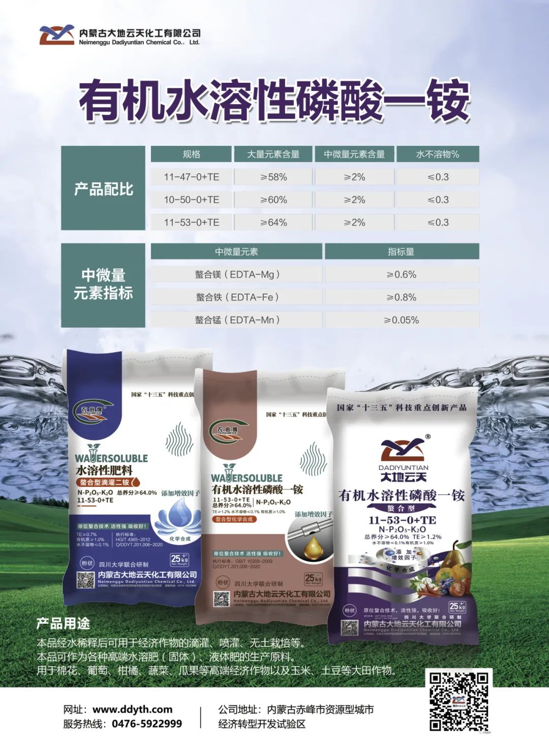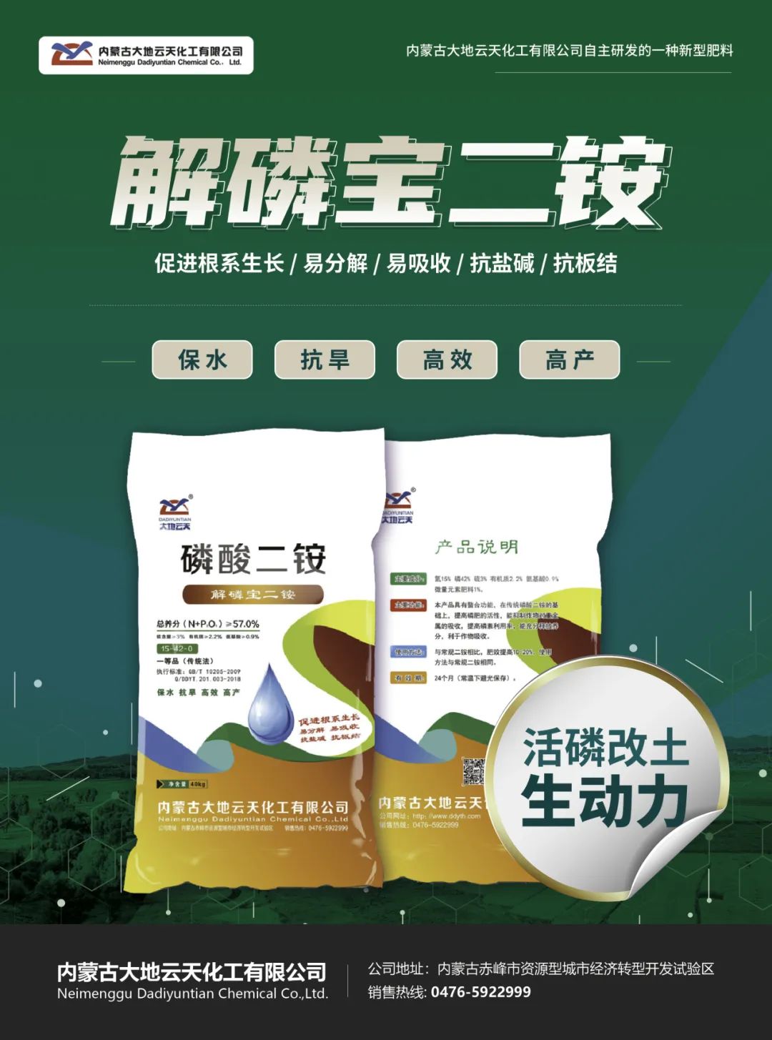 公司生产采用国际先进、国内领先的工艺技术,所生产的“大地云天”、“解磷宝”、“真本色”“黑合力”“麟聚力”“精品六六”等系列品牌磷复肥产品质量稳定、氮及水溶磷含量高、粒子均匀、圆润度好、色泽透亮。国内销售面向东北、华北、西北等地区并远销印度、巴基斯坦、美国、危地马拉等东南亚、中亚、大洋洲、南美洲国际市场,受到一致好评。目前,已有两种产品获得国家级绿色产品认证,三种产品获得内蒙古自治区绿色产品认证。