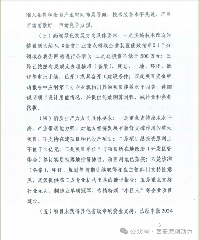 (三)高端绿色发展方向具体要求:一是实施技术改造的装置须已纳入《全省工业重点领域企业装置能效清单》(已分领域在我委网站进行公示);二是总投资不低于500万元;三是已按照有关规定办理核准(备案)、规划、土地、环评、能评等审批手续,已开工或具备开工建设条件;四是项目资金中请报告中应附第三方专业机构出具的项目能效水平报告,详细说明项目设计用能情况,并提供能效测算过程、减排量和参考依据。