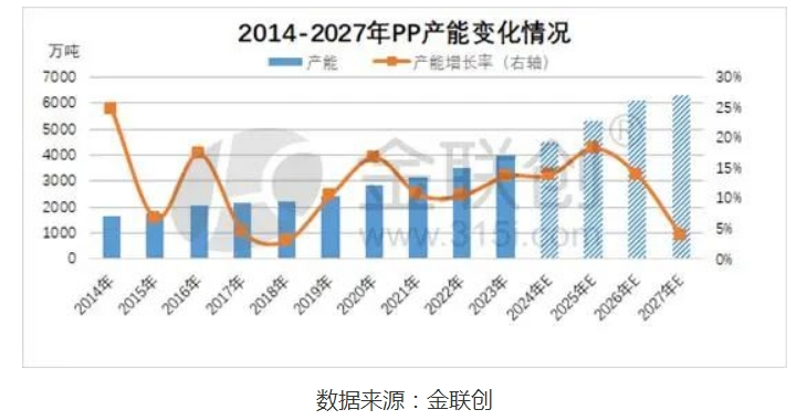 近年来,随着国内聚丙烯产能持续扩张,2024年仍有多套预投产装置,若新装置如期投产,预计2024年全年总产能将达4000万吨以上,此外未来三年,聚丙烯扩能仍然比较集中,预计到2027年,国内聚丙烯总产能将达6000万吨以上。从区域分布来看,西北是供应大区,然需求更集中于沿海一带,PP表观消费排名前三位区域是华东地区、华北地区、华南地区,但近年来主力消费区域产能飞速增长现状之下,运距导致配送时间及运输成本远高于区内本土企业,产品销售压力逐年增大。2014年煤制企业装置集中投放。2015年开始,进入稳定生产期,因过度投产导致了现货的低价竞争加剧,部分计划上马的装置出现延期。2016年投产步伐加快,2020年国内聚丙烯市场迎来10年内第三轮扩能高峰。2023年扩能计划再次激增,截止2023年底,国内聚丙烯计划产能达3964万吨。较2022年增加480万吨,增速13.68%。后期来看,市场供应端攀升之后,各项风险将逐步增加,首先是产能过剩风险,项目的持续上马将减少聚丙烯对外依存度,有效改变聚丙烯市场供需格局,降低运输成本同时带动下游塑料加工企业的发展。但产能不断投放势必带来产量的快速增长,低价产品增多导致市场低价竞争加剧,“拼低”时代各厢厮杀,要想将过剩的产能转化为出口还需冲破各种国际上统一的出口标准,因此,对于过剩的产品更多的还将由国内市场自行消化。其次是产品竞争力风险,目前处于产能集中投放后成熟运行期的煤化工产业,对聚丙烯产业产生了持续冲击,转型升级迫在眉睫,具备科研优势的石化企业,正在逐步主动脱离竞争激烈的低端市场,不断加大研发投入,研发生产专用料,仿制进口高端料。在大型炼化一体化建设中,利用技术创新引领聚烯烃产业链价值提升,实现产品结构向高附加值调整,尤其是在高端产品方面的突破,将对中国石化产业转型升级,提升产业竞争力发挥十分重要的作用。当前我国炼化行业已经形成以中石化、中石油两大集团为主,中海油、中化、煤化工企业、民营企业及外资企业等多重主体参与的多元化市场格局,以民企为主的大批新建项目纷纷上马且进程迅速。当前企业面临产业结构过剩的矛盾,安全环保形势严峻,工艺技术创新制约行业发展等问题同时存在,迫使各企业积极转型升级。各生产企业要以提高产业竞争力为基础,适度发展,同时要市场化布局,在产业结构上实现高端化延伸,以此稳居全国同行业前列。过度产能扩张将推动市场竞争格局快速转变,新投产装置多为百万吨级,生产能力较强,且生产产品多元化。在竞争不断加剧的当下,当产能与生产力不匹配时,适时淘汰或关停部分生产能力较弱、产品相对单一的老装置,减少低端市场竞争,确保生产企业走出一段“增产增效”的绿色转型发展道路,保障行业的可持续发展。【版权与免责声明】以上信息由国威塑料收集整理,版权归原创所有,转载此文是出于传递更多信息之目的