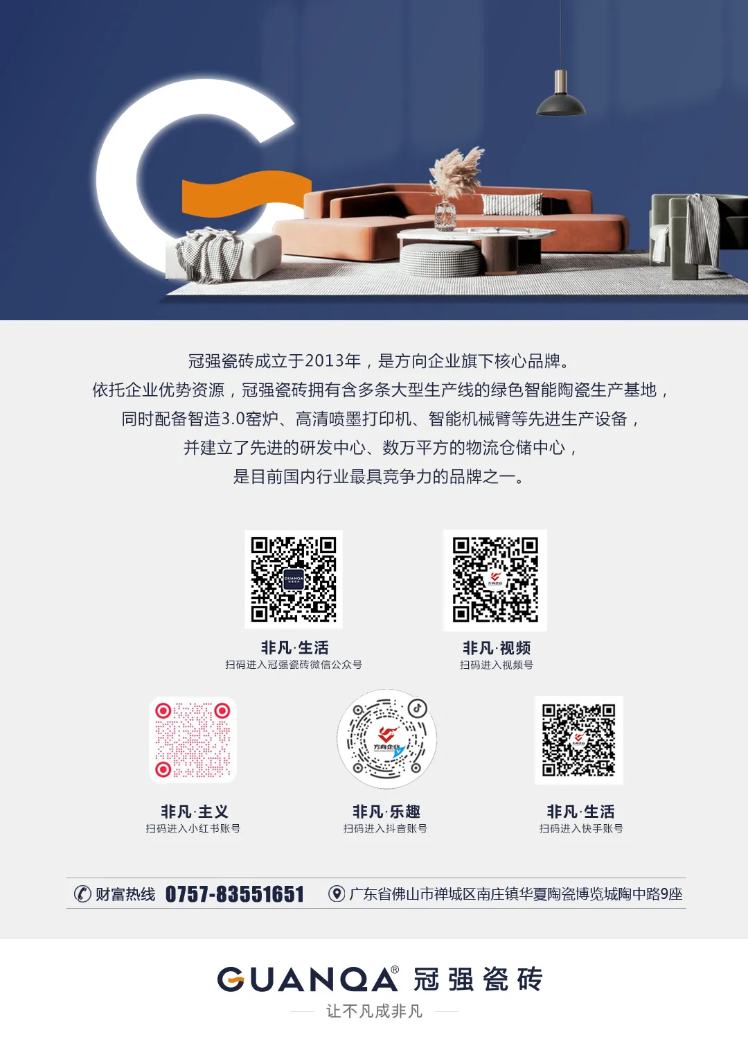 面对新一轮科技革命和产业变革,冠强瓷砖立足新发展阶段,依托所属集团的技术平台和资源,把科技创新摆在突出位置,持续打造创新数智研发体系。目前已拥有西樵、宏景、宏建三大制造中心,以及技术中心,赋能科技成果落地,满足新一代消费者对舒适、健康、实用等个性化需求,保障产品高品质输出。