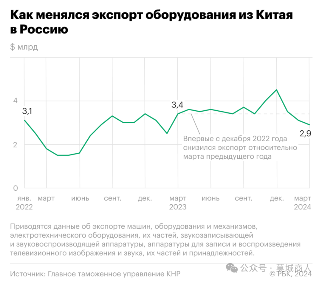2024年3月,中国减少了对俄罗斯的机械、设备(包括电气设备)、机构及其零部件(《对外经济活动商品命名法》第84组和第85组——按价值计算的统称)的直接供应,统计数据来自俄罗斯联邦统计局的统计数据。中华人民共和国海关总署(RBC)显示,4月20日发布研究报告)。与 2023 年 3 月相比,中国对俄罗斯的此类商品出口下降了 15%(至 29 亿美元)。上一次该产品类别出现下降是在 2022 年 12 月,到 2021 年 12 月下降了 11%。
