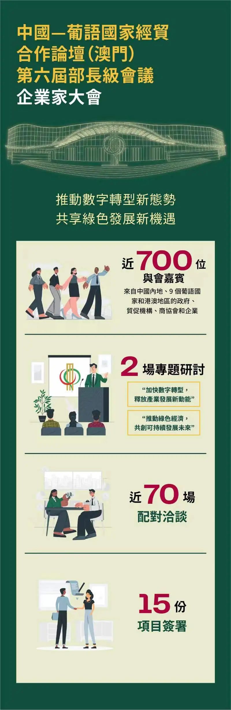 “企業家大會”作為“中國—葡語國家經貿合作論壇(澳門)第六屆部長級會議”配套活動之一, 致力推動澳門中葡平台建設。活動進行近70場配對洽談;安排15份項目簽署,涉及“1+4”產業及聯動橫琴粵澳深度合作區合作,合作成果進一步豐富多元。