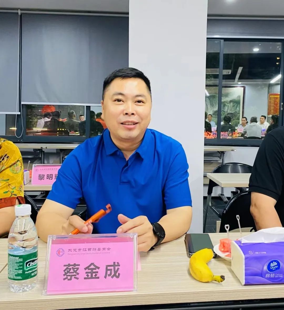 我会参加接待有:会长蔡金成、执行会长丁陈兰、周山、谢鹏椿,秘书长肖诚飞,执行秘书长李龙秀、 黄倩、副会长刘云清、刘玉芳、 刘永亮、松湖片区执行秘书长李卫忠、城区片区执行秘书长黎明辉、服装委员会执行秘书长刘冀、电子五金执行秘书长钟瀚慧、专职秘书刘丽娟。