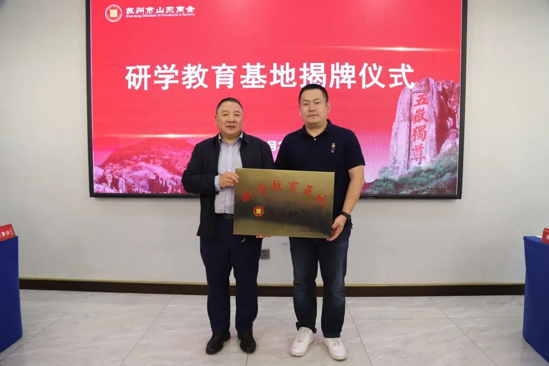会长梅旭明为副会长林力功企业—渚友农场授予苏州市山东商会研学教育基地牌匾。