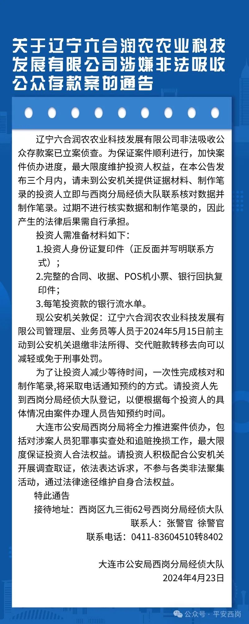 关于辽宁六合润农农业科技发展有限公司涉嫌非法吸收公众存款案的通告