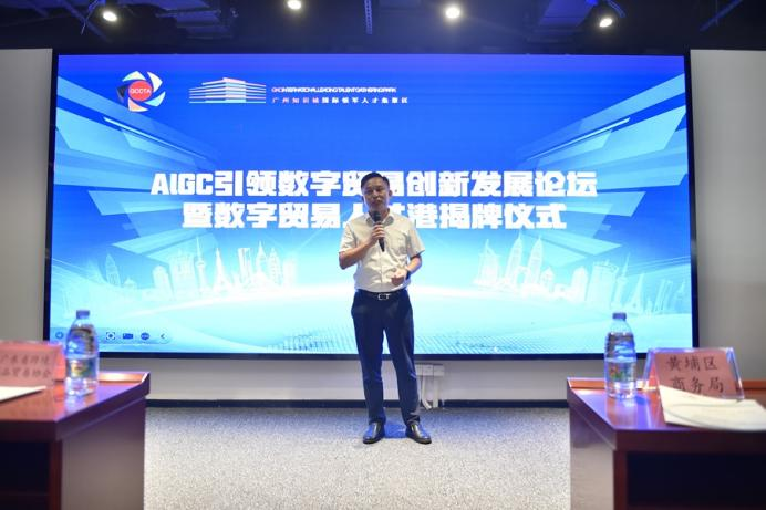 黄埔区商务局副局长郑钦泽为论坛致开幕词,首先对黄埔区电商业态的快速发展给予期望。他表示黄埔区开发区作为改革开放的先行地,要进一步发展新质生产力,在将来能够结合AIGC引领黄埔区创新发展。