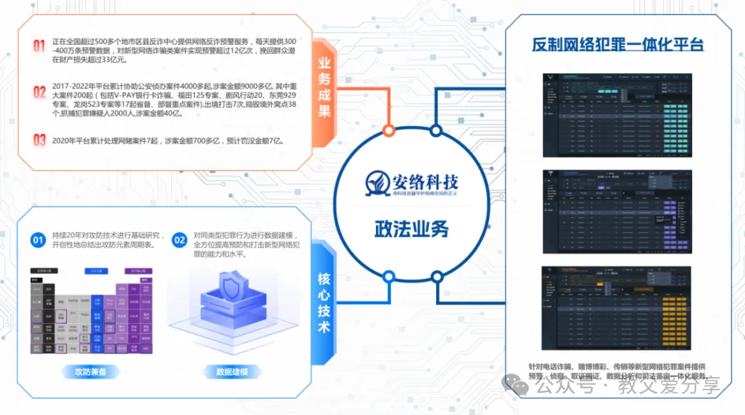 近年来,安络科技继续发挥“攻防兼备”的特长,率先将先进的网络安全技术应用于新型电信网络犯罪的反制领域,围绕新型犯罪的“打防管控”,建立起了对警方的全链条支持能力。