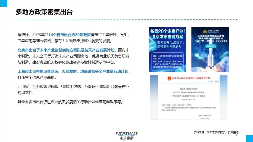 多地方政策密集出台,2023年共14个省市出台约20项政策,如北京市出台了未来产业创新实施方案以及航天产业发展计划,上海市出台了布局卫星制造、火箭发射、地面设备等全产业链行动计划等政策。