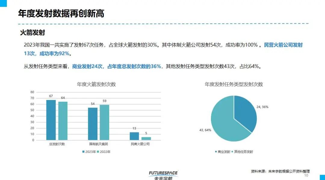 年度发射数据再创新高,2023年我国一共实施了发射67次任务,其中,民营火箭公司发射13次,成功率为92%;从发射任务类型来看,商业发射24次,占年度总发射次数的36%。