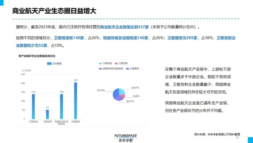 商业航天产业生态圈日益增大,国内商业航天企业数量不断增多,截至2023年,国内已注册并有效经营的商业航天企业数量达到537家(未将子公司数量统计在内),按照不同的领域划分,卫星制造有140家,地面终端及设施制造140家,卫星服务为205家,卫星发射企业数量较少为52家;按照不同地区分布,主要集中在北京、上海、广东、陕西、江苏等前5个省/直辖市。