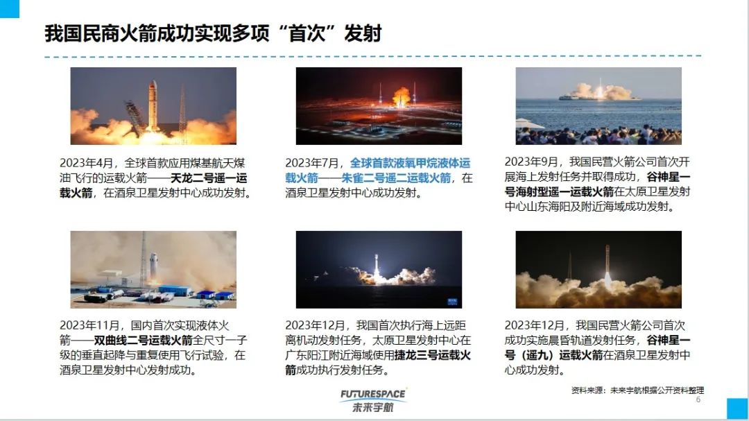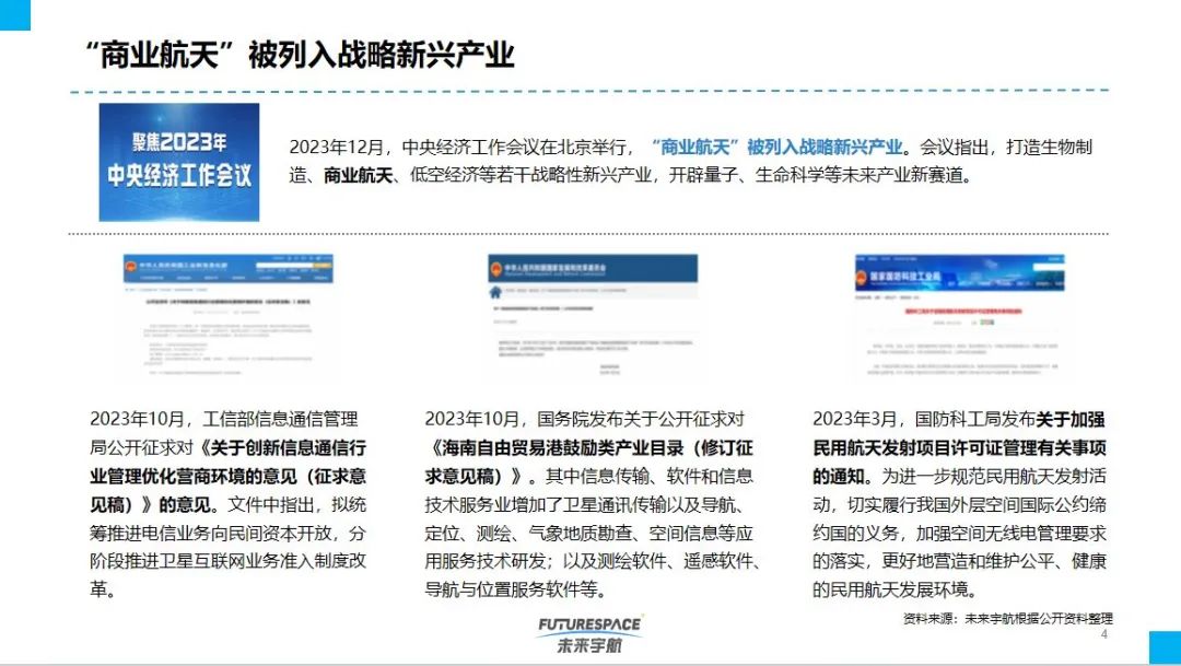 2023年,在党和国家各项政策的支持下,中国商业航天产业取得突破发展:政策方面,“商业航天”被列入战略新兴产业,2023年12月中央经济工作会议指出,打造生物制造、商业航天、低空经济等若干战略性新兴产业,开辟量子、生命科学等未来产业新赛道。产业园建设方面,全国多地区产业基地项目正式开工建设,如武汉国家地球空间信息产业化基地二期项目正式开工等。商业火箭发射方面,我国实现多个“首次”发射,如蓝箭航天在酒泉发射中心成功发射全球首款液氧甲烷液体运载火箭——朱雀二号遥二运载火箭。全国重要会议论坛圆满举办等。