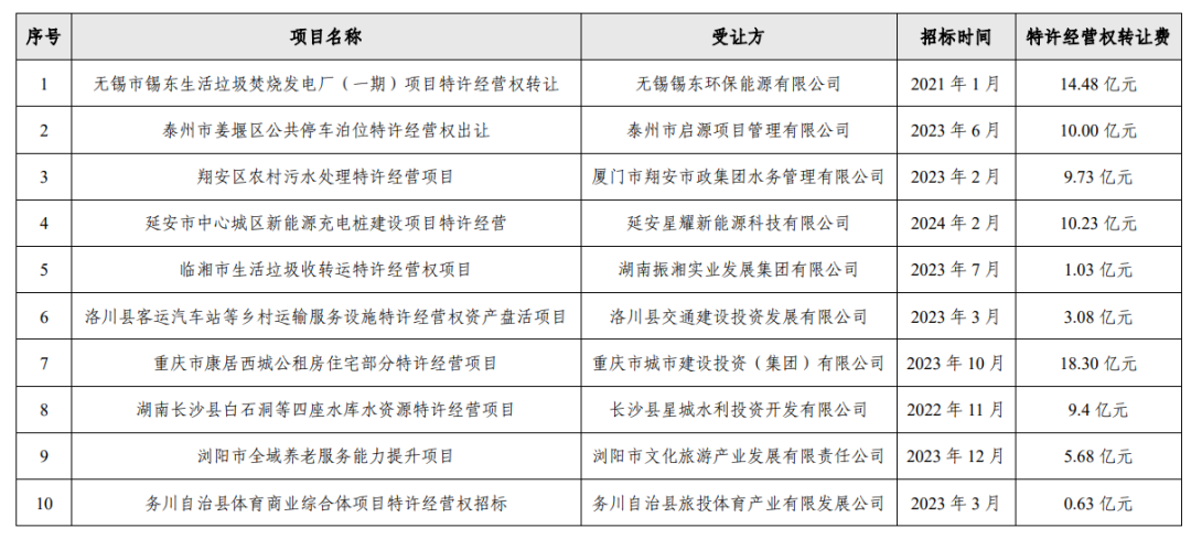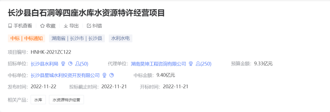 2022年11月22日,长沙县星城水利投资开发有限公司中标长沙市水利局的湖南省长沙县白石洞等四座水库水资源特许经营项目。特许经营权转让费9.4亿元。通过特许经营权转让引入社会资本负责存量水库设施的占有、使用、收益、管理、运营和维护,提供原水供水服务和农业灌溉供水服务,并获得供水服务收入。