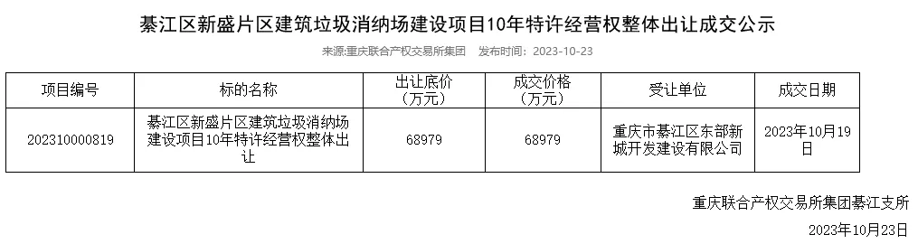 方达咨询研究发现,2023年10月23日,重庆市綦江区新盛片区进行建筑垃圾消纳场建设项目10年特许经营权出让,受让单位是重庆市綦江区东部新城开发建设有限公司,成交价格是68979万元。