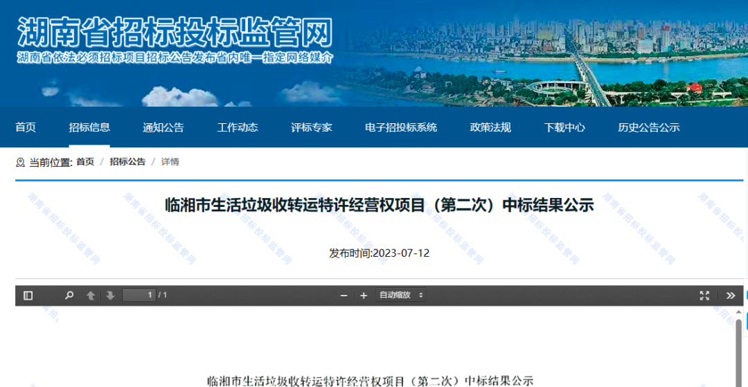 2023年7月12日,湖南省招标投标监管网发布临湘市生活垃圾收转运特许经营权项目中标结果公示,中标供应商为湖南振湘实业发展集团有限公司,服务年限为30年,合同金额为10327.67万元。