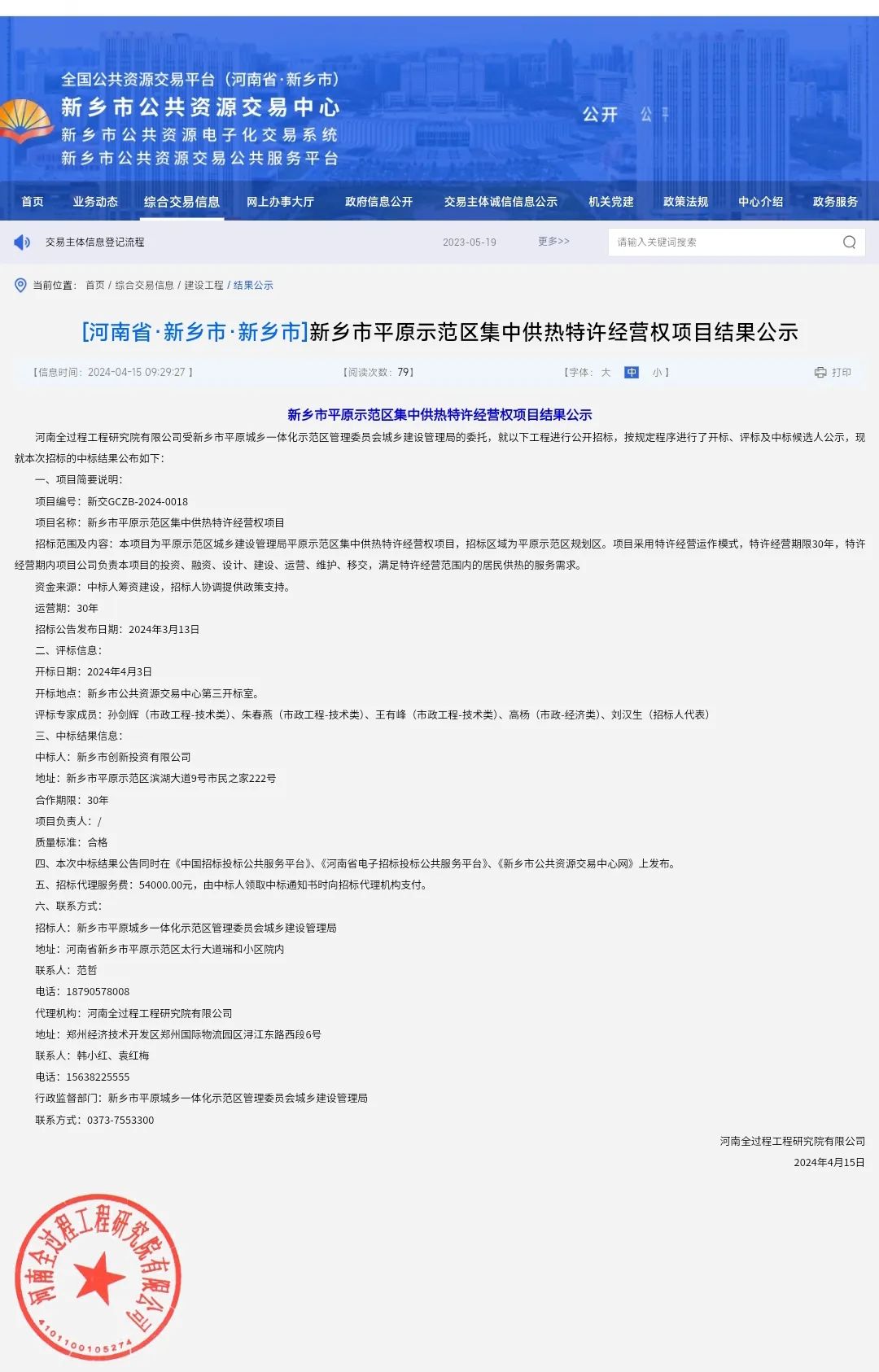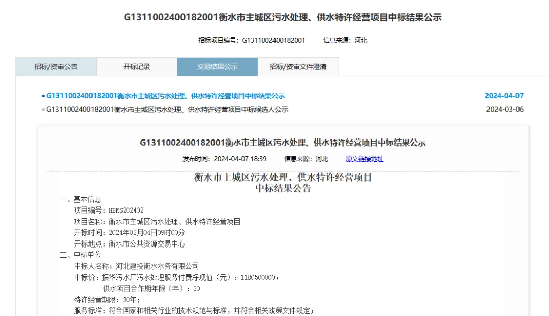 4月7日,河北衡水市主城区污水处理、供水特许经营项目中标结果公示,中标人:河北建投衡水水务有限公司,中标价:振华污水厂污水处理服务付费净现值:1180500000元;供水项目合作期年限(年):30。特许经营期限:30年。