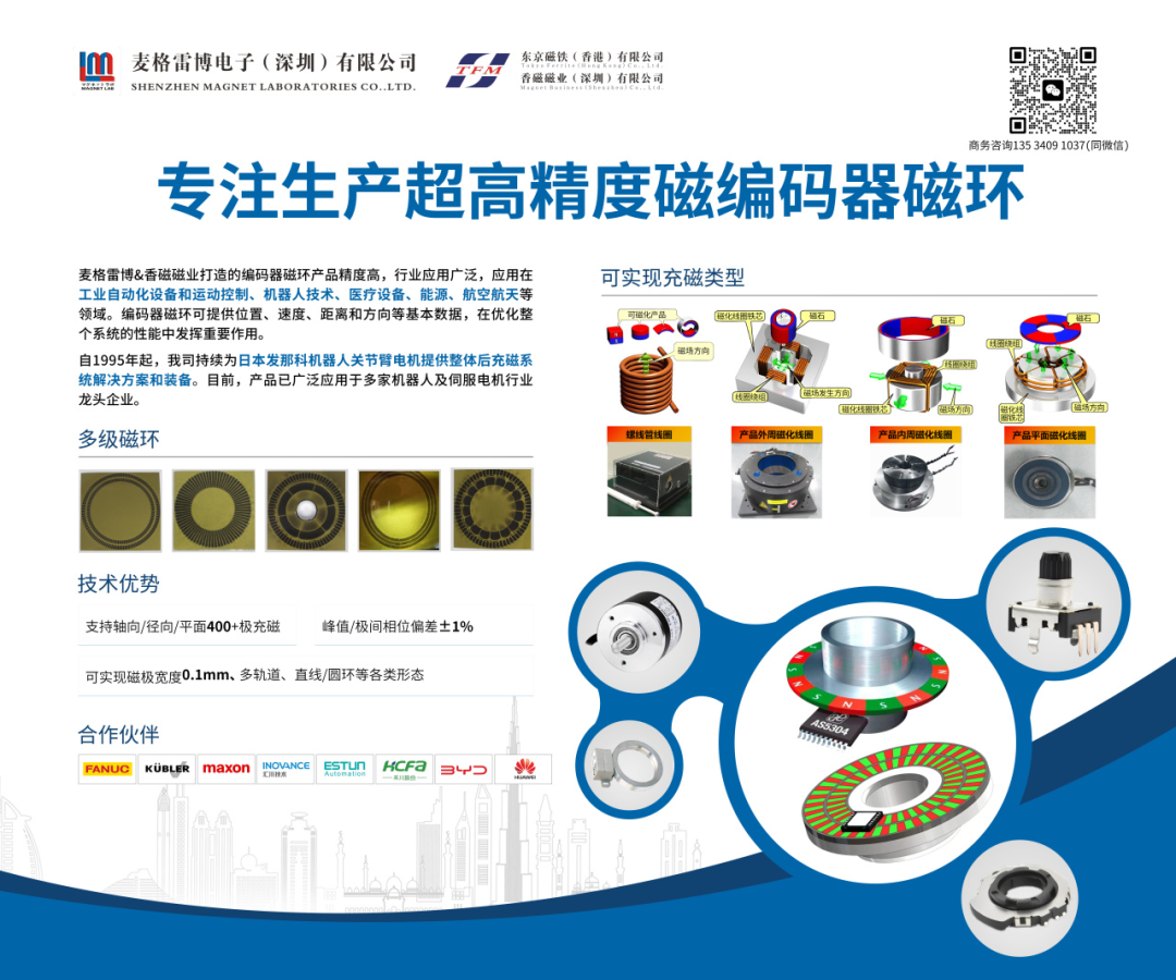 会上,麦格雷博&东京磁铁&香磁磁业向参会观众展示超高精度的磁编码器磁环产品,赋能机器人行业发展。自1995年起,麦格雷博就持续为日本发那科机器人关节手臂提供整体充磁系统解决方案和装备,目前我们的整体充磁解决方案已经在多家机器人及伺服电机行业应用,在智能制造和磁性材料行业领域的独特优势和技术实力,赢得了现场观众的高度评价和认可。这也将激励着麦格雷博&东京磁铁&香磁磁业继续发挥自身优势,不断提升产品和服务质量,为机器人行业的发展添砖加瓦,做出自己的贡献。