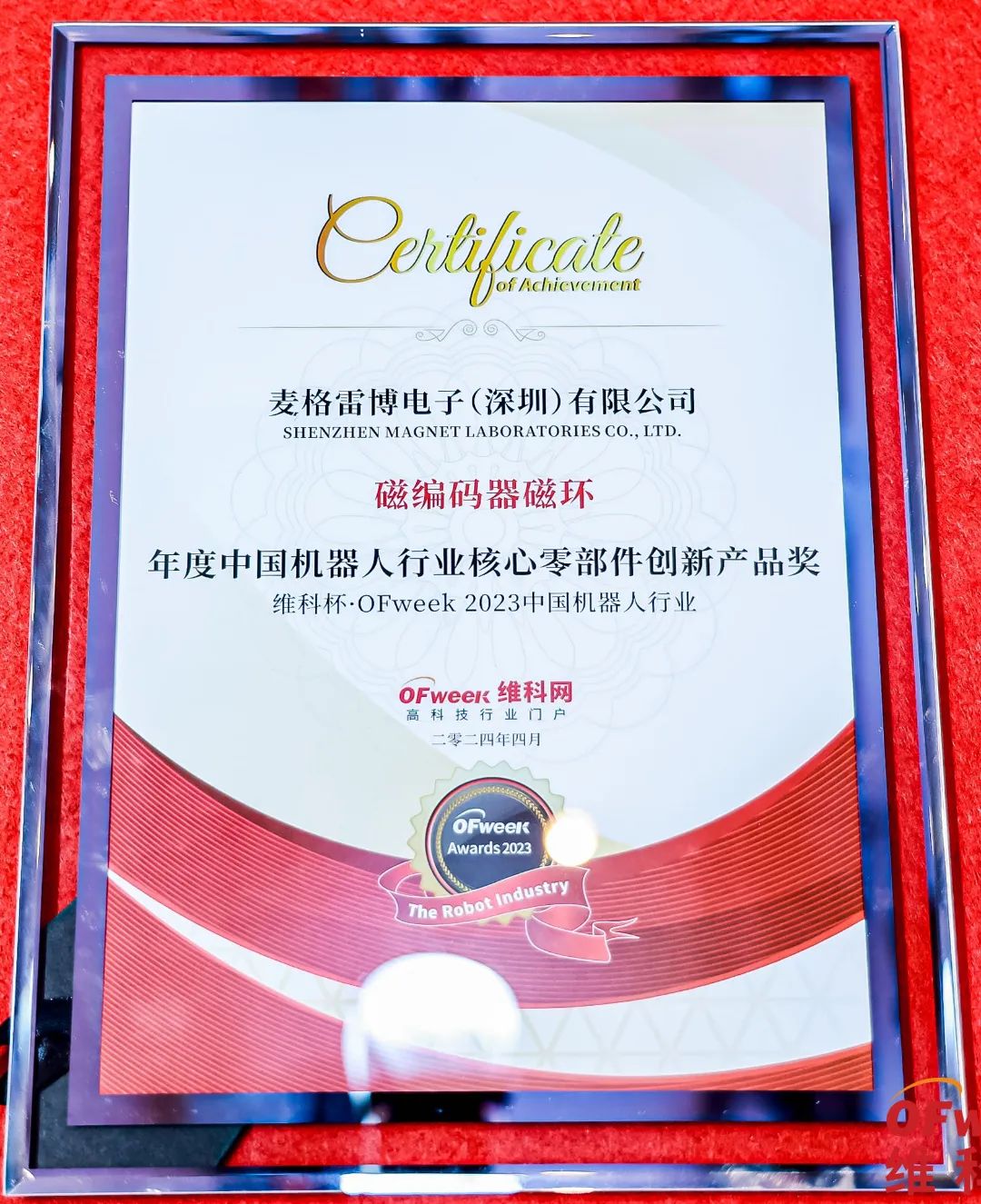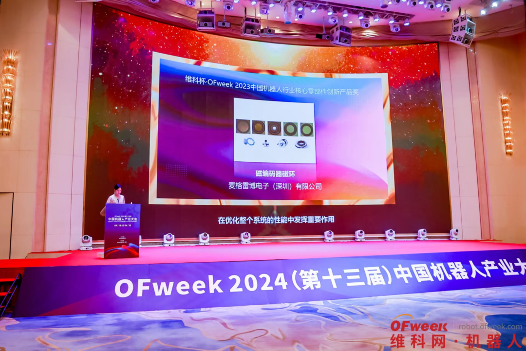 2024年4月18-19日,OFweek 2024(第十三届)中国机器人产业大会,在在深圳·安蒂娅美兰酒店隆重举办。麦格雷博&香磁磁业作为机器人产业充磁检测与磁性材料供应综合解决方案商受邀出席大会,并荣获“年度中国机器人行业核心零部件创新产品奖”。