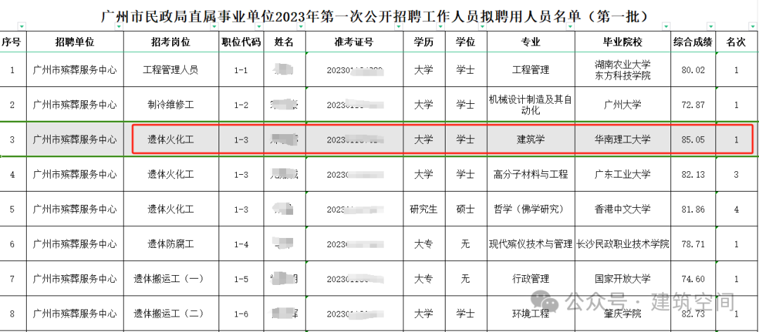 其中华南理工大学 建筑学专业 的一位同学,以第一名的成绩考上了广州市殡葬服务中心的“遗体火化工”岗位。