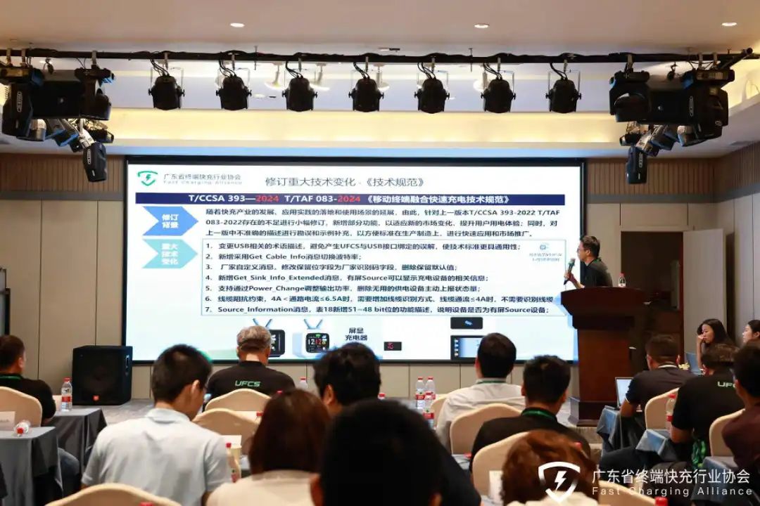 随后,协会技术工作组代表龙智帆向全体会员作新版UFCS标准解读,全面讲解UFCS 1.2 and 2.0技术更新方向。随着快充产业的发展、应用实践的落地和使用场景的延展,针对上一版本T/CCSA 393-2022 T/TAF 083-2022存在的不足进行小幅修订,主要是新增采用Get_Cable_Info消息切换波特率;新增Get_Sink_Info_Extended消息,有屏Source可以显示充电设备的相关信息;删除无用的供电设备主动上报状态量;支持通过Power_Change指令调整输出功率。